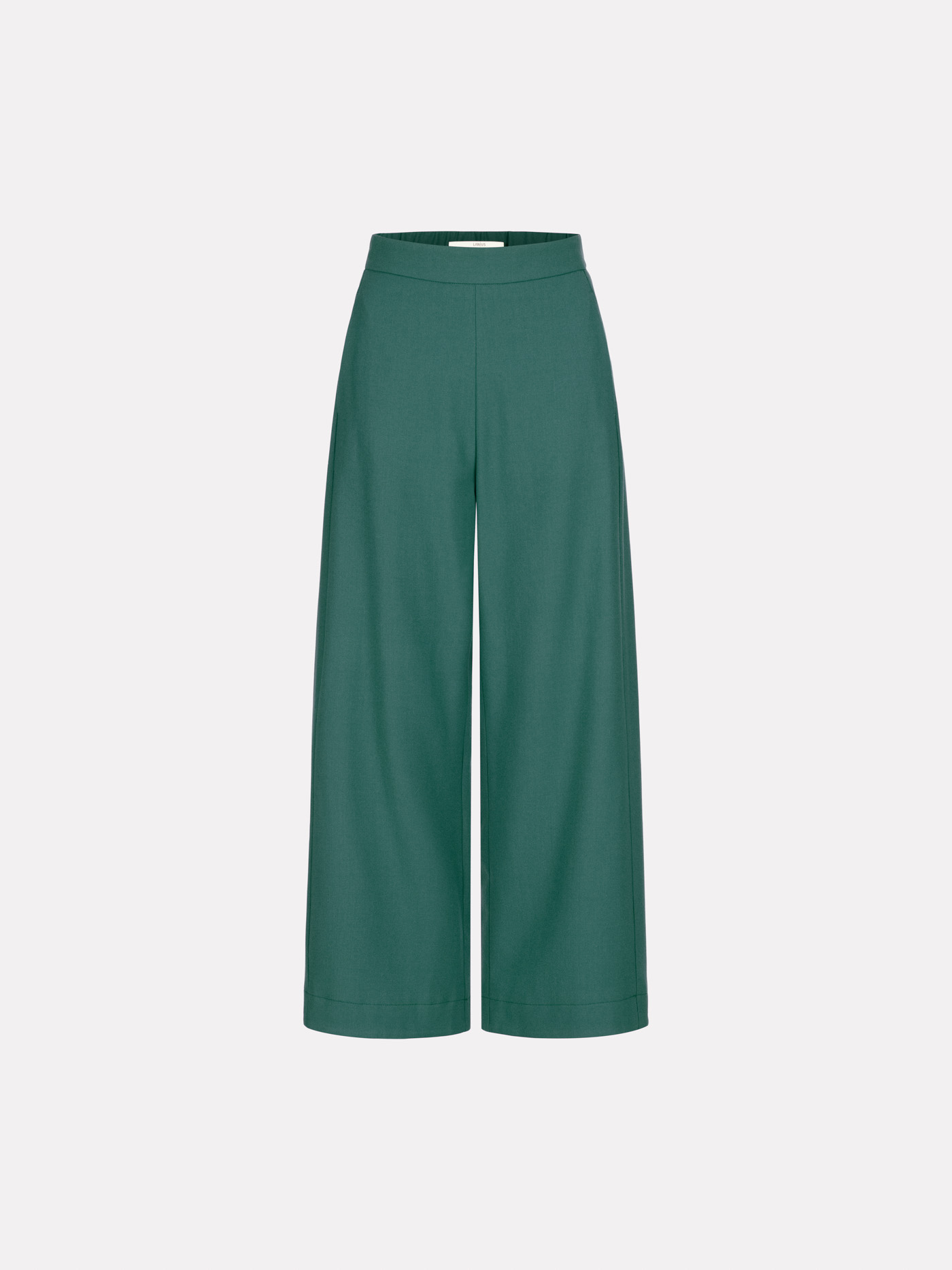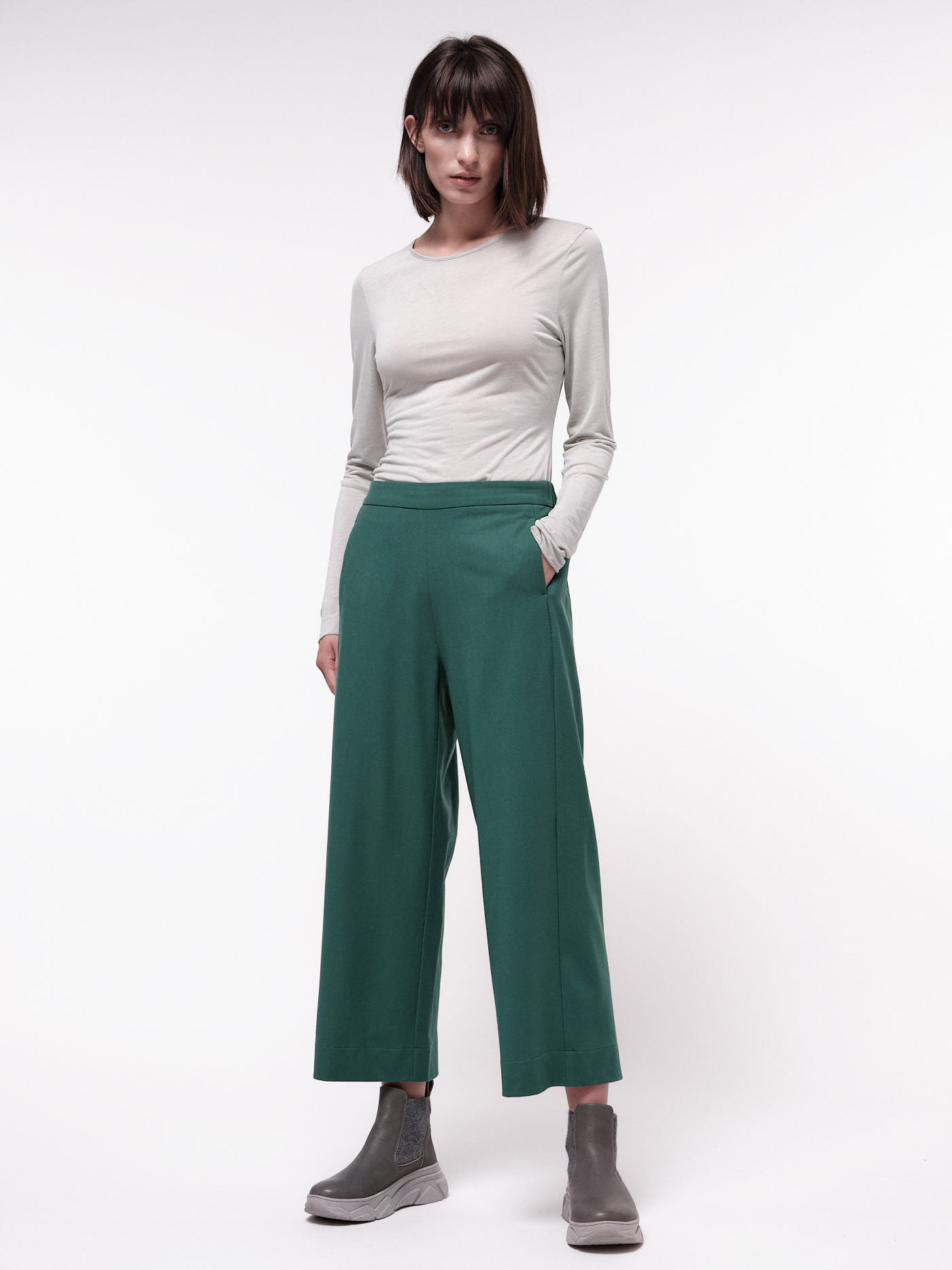 Fließende, verkürzte Hose in 7/8 Länge mit weitem Bein, mittelhoher Bund ohne Reißverschluss und Knöpfe mit Gummizug und zwei seitlichen Eingriffstaschen. Die kontrolliert gewonnene Bio-Schurwolle ist winddicht, temperaturausgleichend und strapazierfähig und somit perfekt für kältere Temperaturen geeignet.