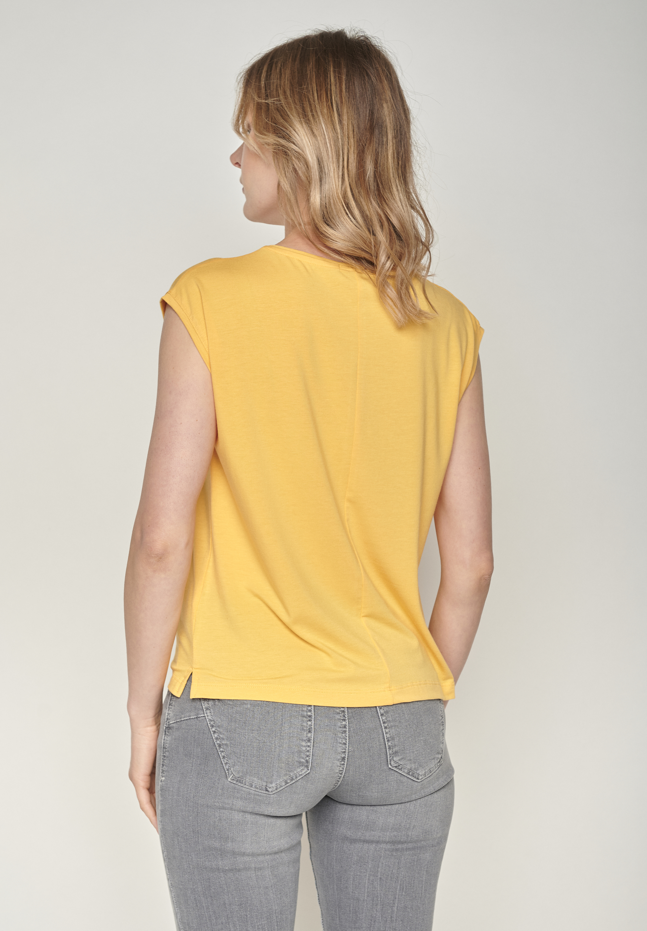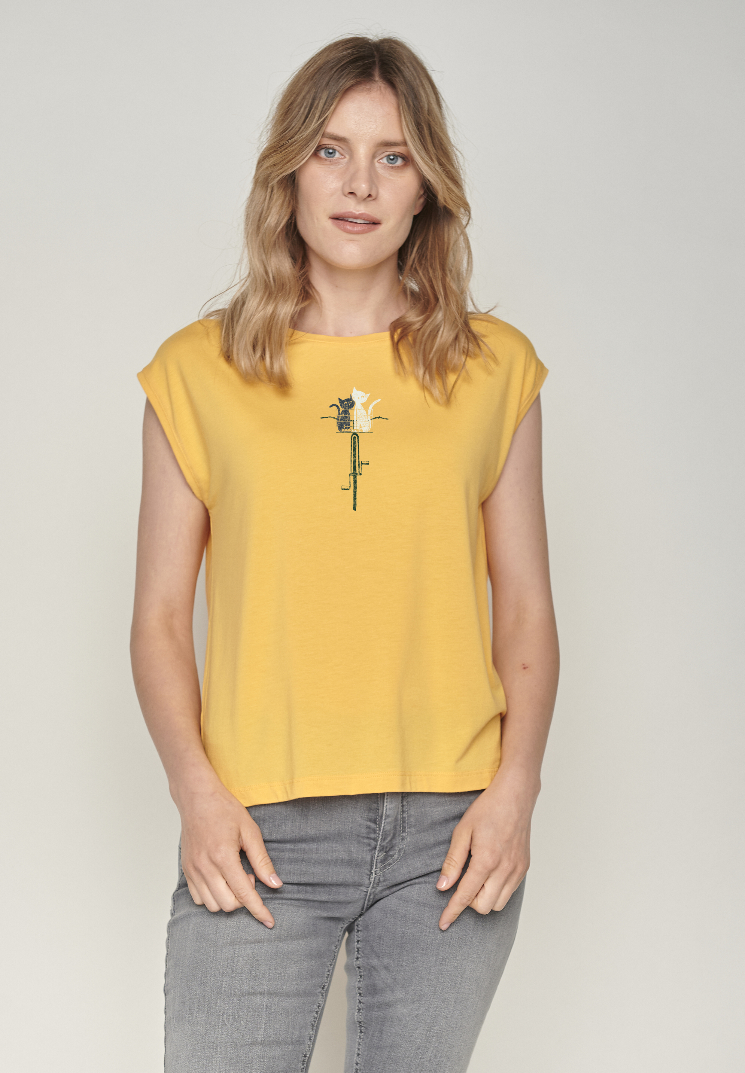 Das T-Shirt 'Tender' besteht aus 68% Bambus, 4% Elasthan und 28% Bio-Baumwolle. Es hat kurze Ärmel und locker geschnitten.
