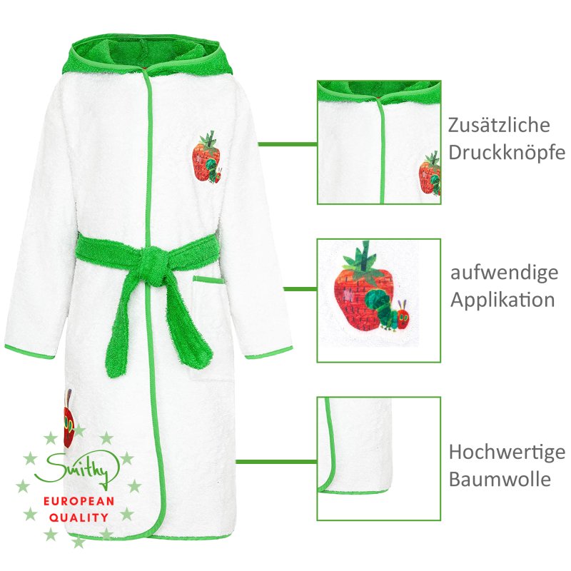 Der kuschelige Kinderbademantel mit der bekannten Raupe Nimmersatt ist aus hochwertigem Frottee gefertigt.