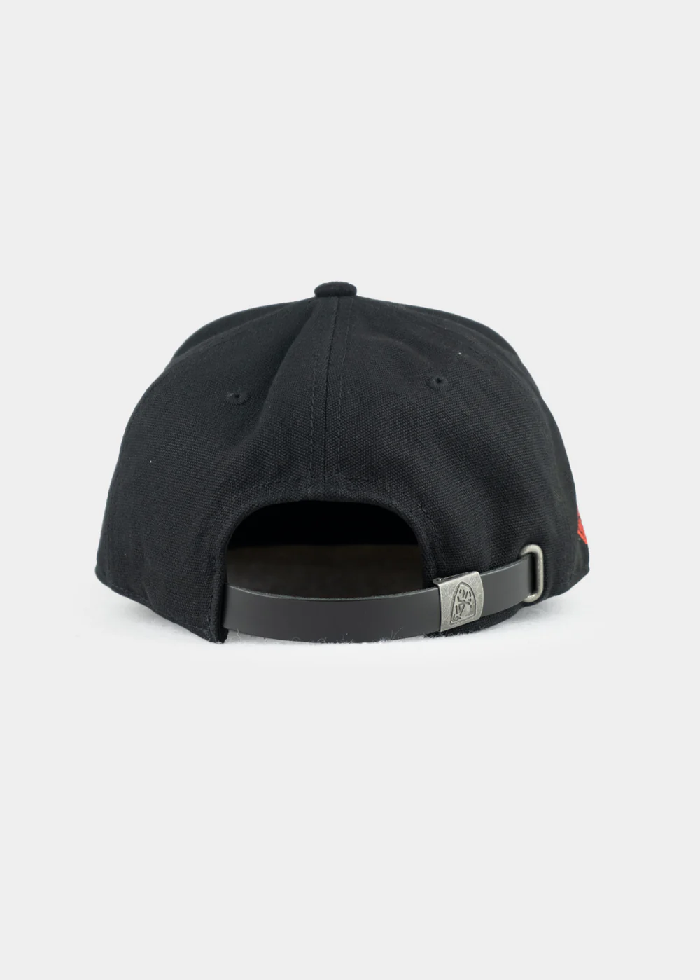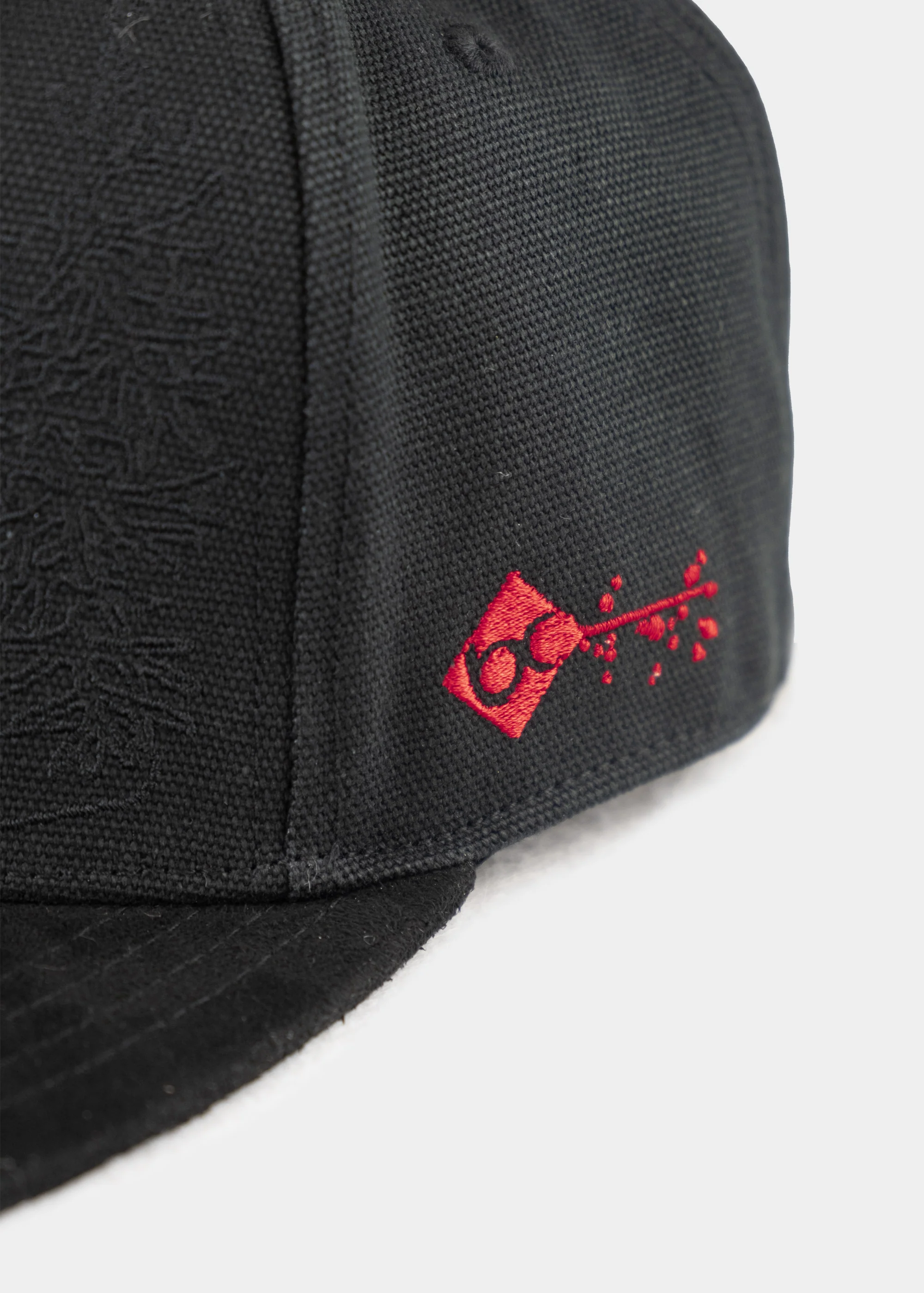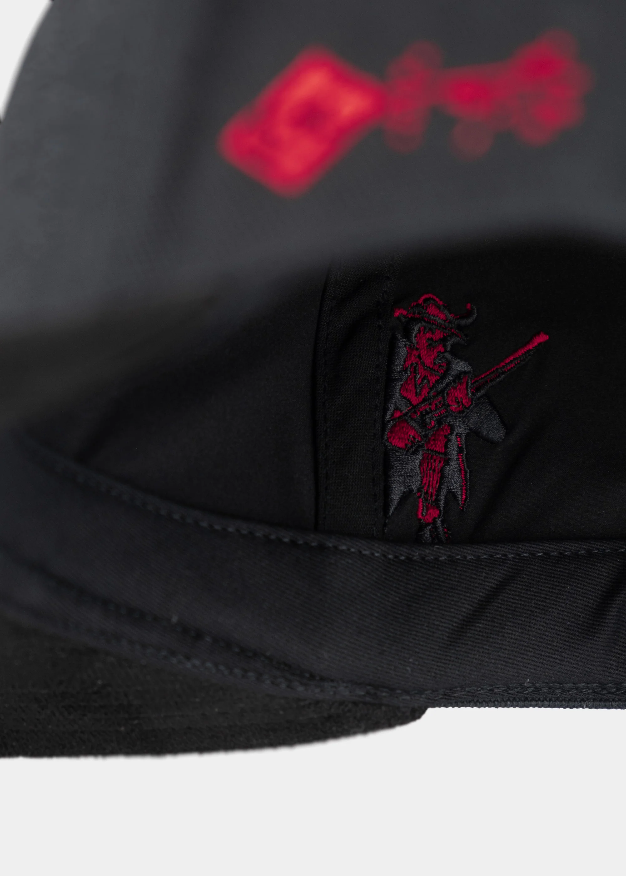 Eine schwarze Cap mit blutrotem "Wuid-Samma"-Stick und bleifarbener Schliesse stellt klar: hier verbirgt sich etwas! So findet man bei genauem Hinsehen noch subtilen, schwarzen Motivstick mit erlegter Gams, zerlegtem Stutzen und Rucksack im Unterholz grossflächig auf der Krone des Caps. Er wirkt fast nur wie Textur und verheisst ein weiteres Geheimnis: im Inneren sitzt der gestickte Wilderer "Hacker Sepp" auf einen Bock an! Die Cap ist Teil der "wuid samma" Kollektion in Kooperation mit dem Illustrator, Zeichner und Maler