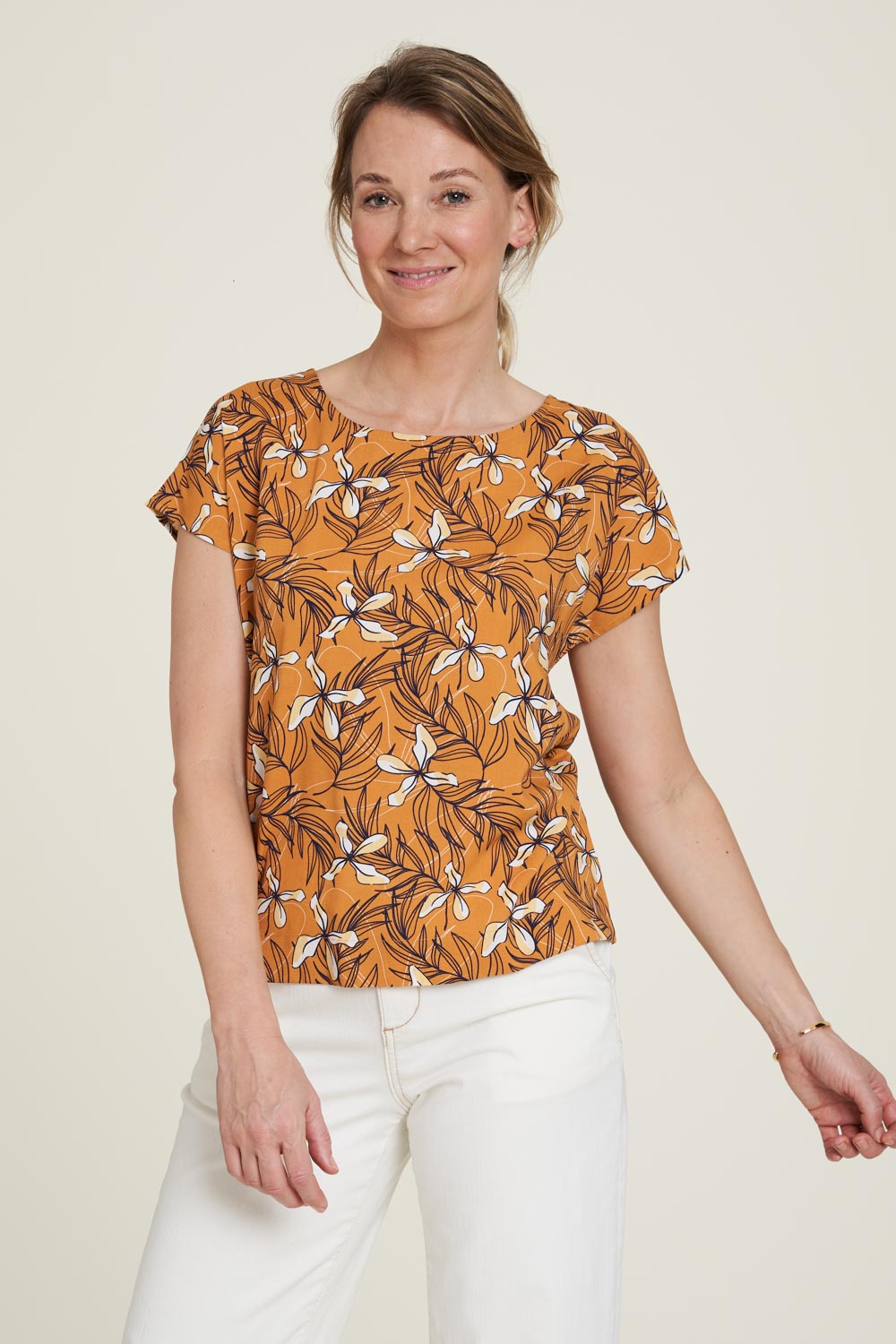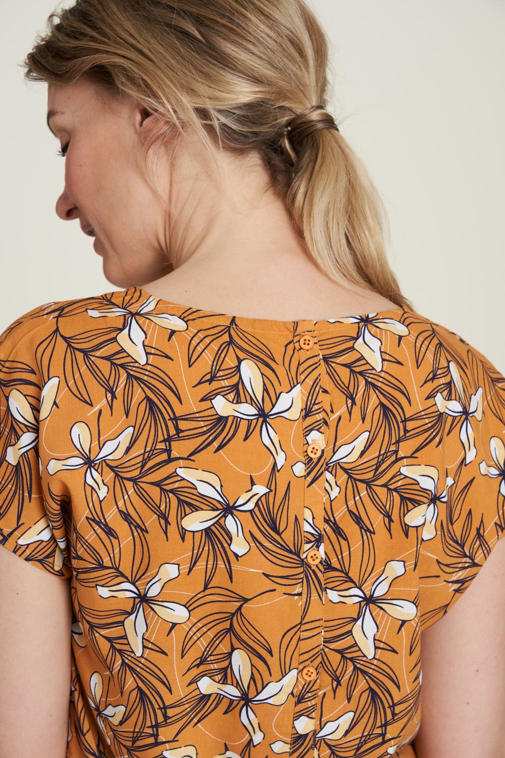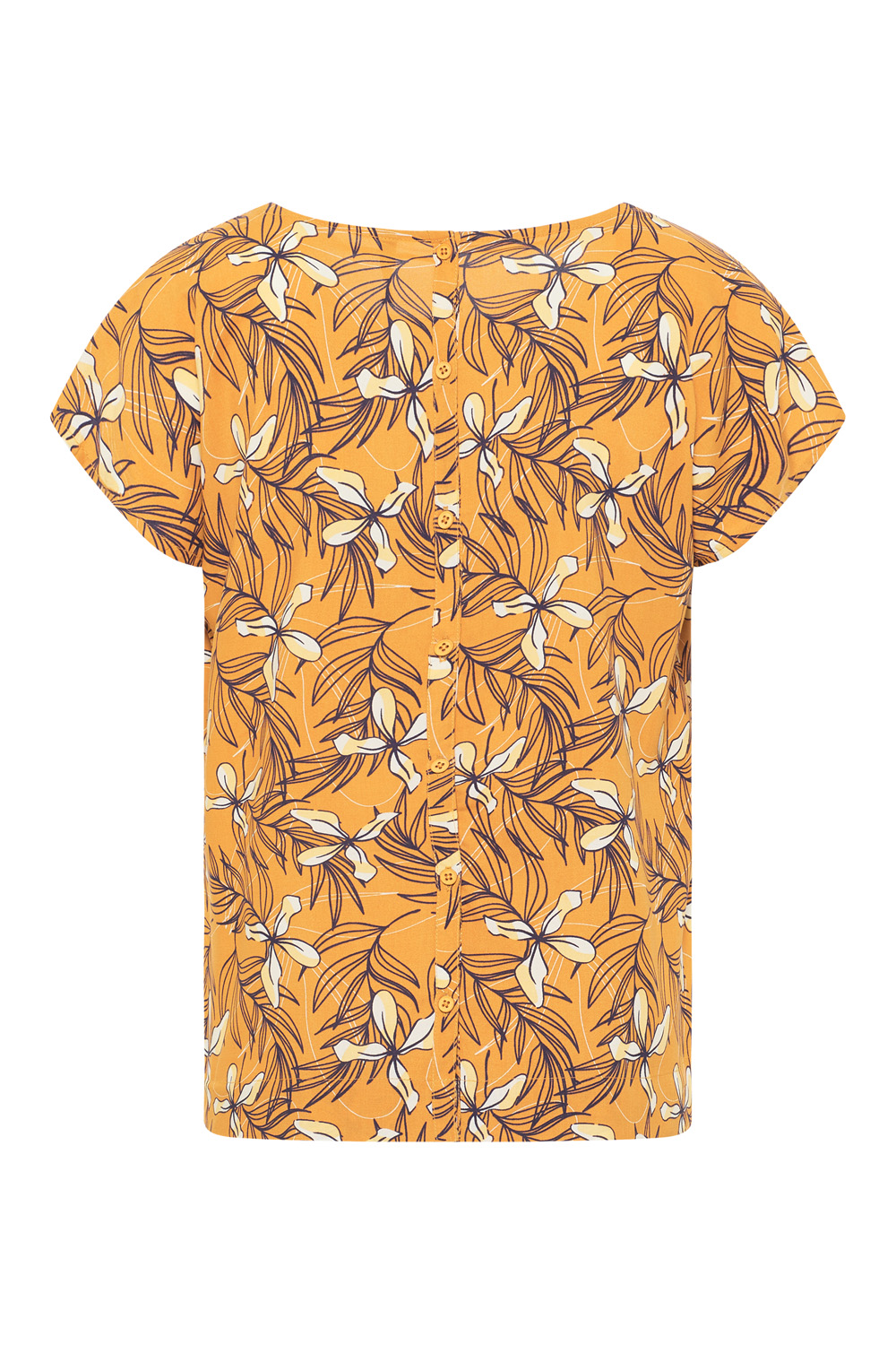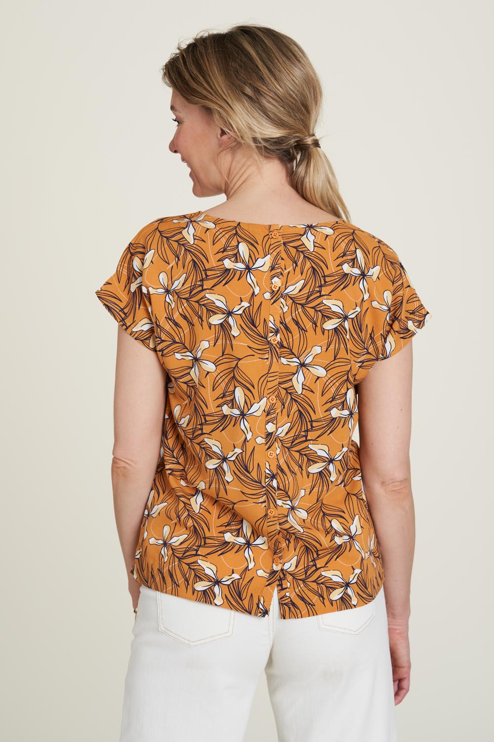 Diese luftige Bluse hat als besonderes Detail eine Knopfleiste am Rücken. Die kurzen Ärmel und der bequeme Schnitt sind eine perfekte Alternative zum T-Shirt.