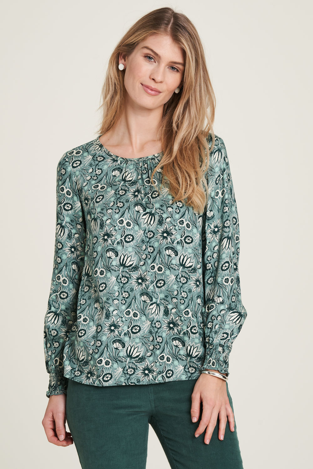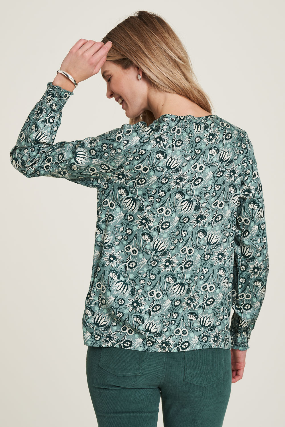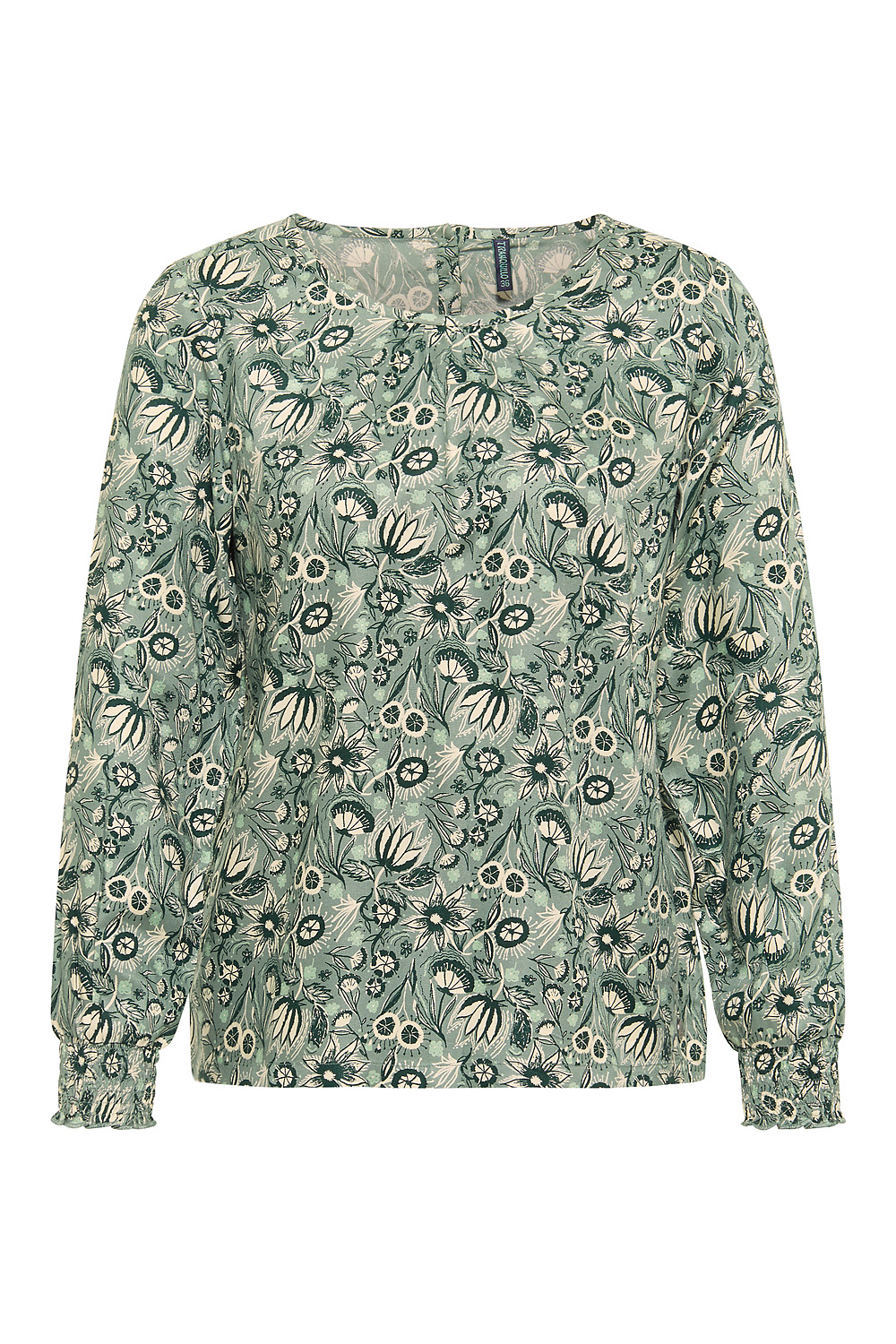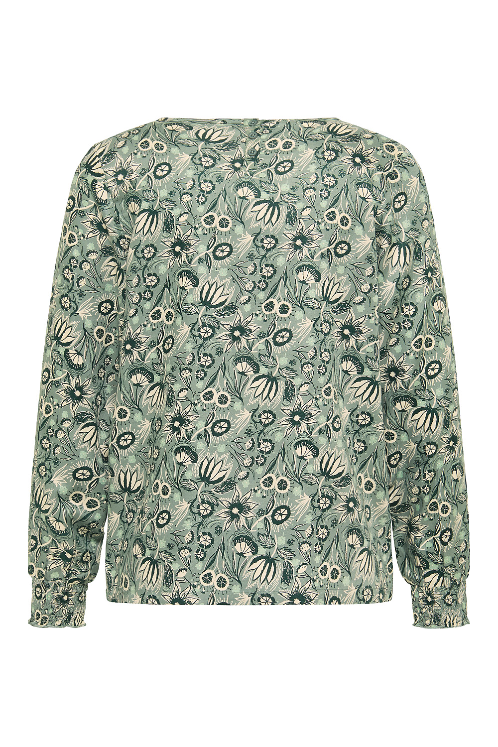 Die pure Viskose ist umweltfreundlich und zeigt sich in einer angenehm soften Qualität und im modernen Muster. Der lässige Schnitt und der Rundhalsausschnitt schenken dir noch mehr Komfort, während knöpfbare Armabschlüsse mit Schlitz und das Cut-out-Detail hinten verspielte Akzente setzen.