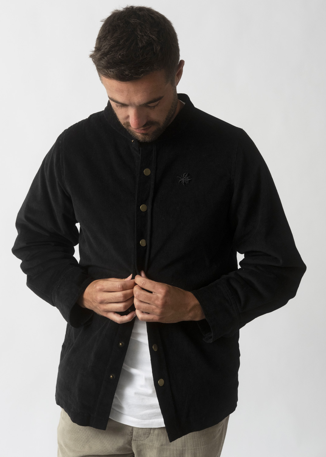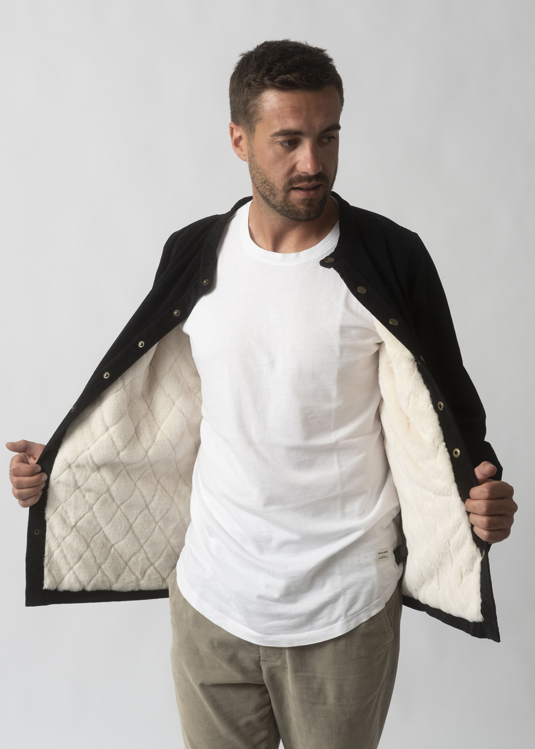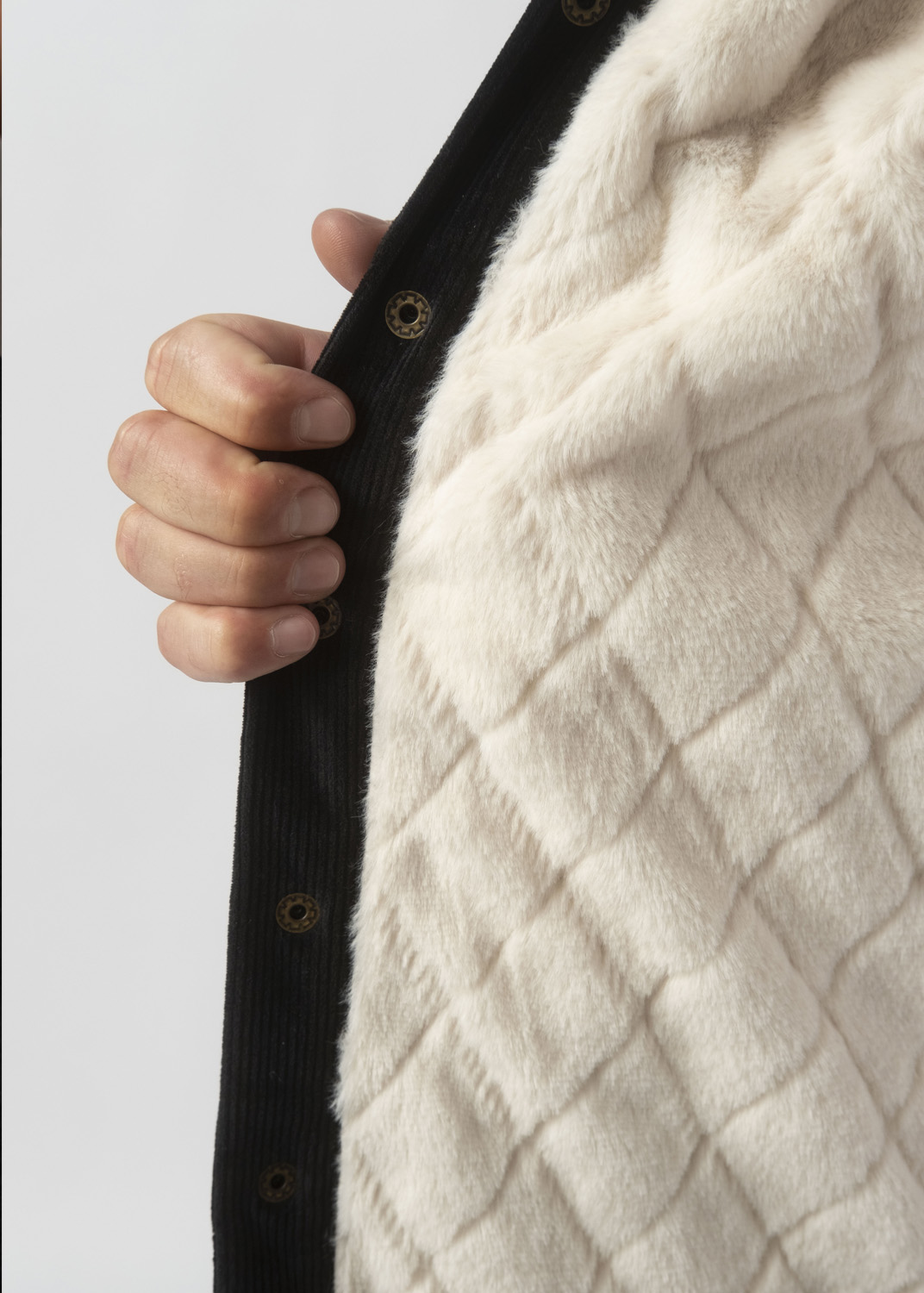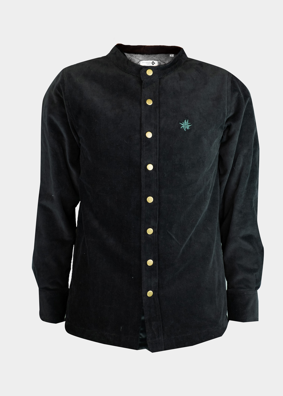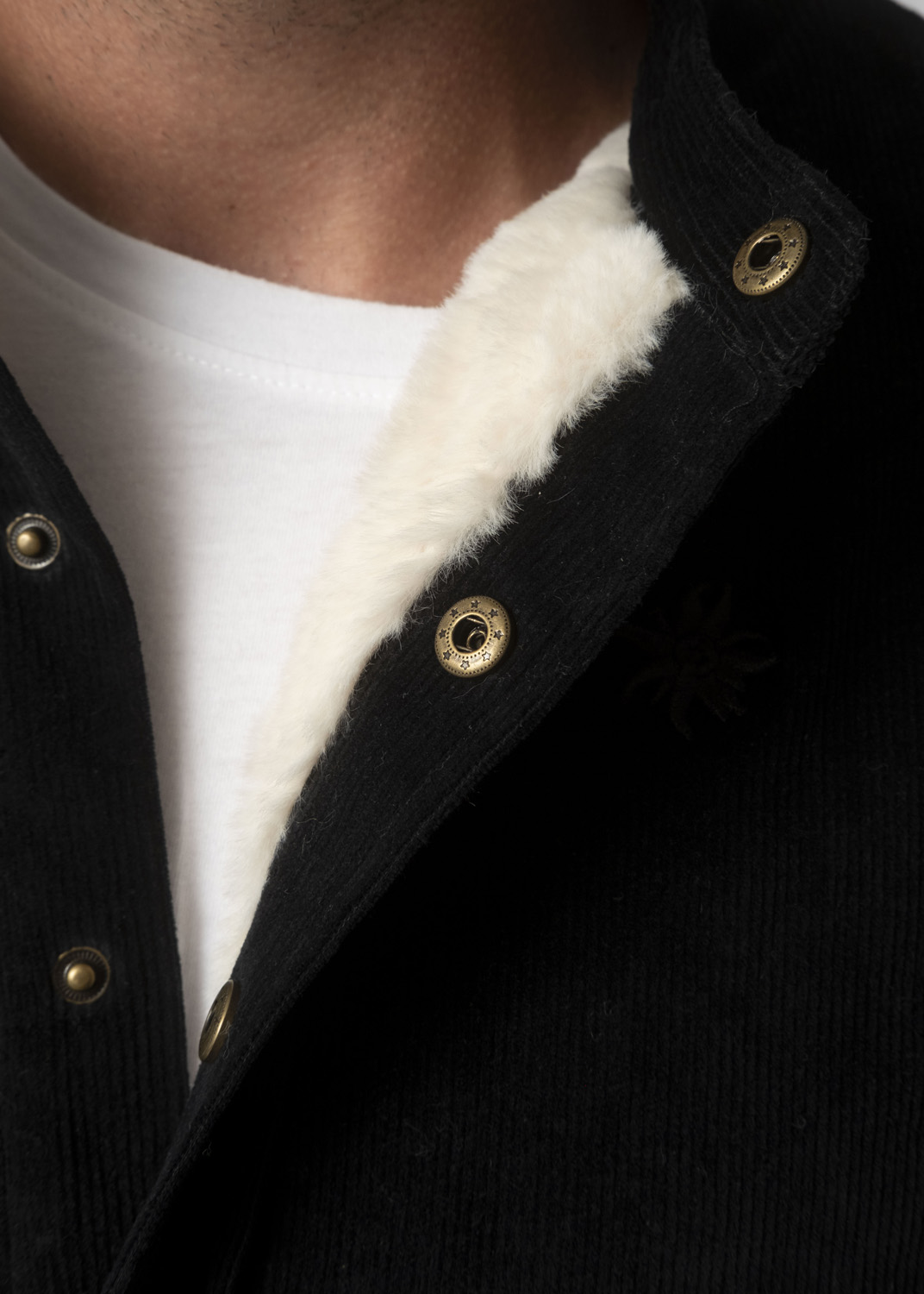 Wir präsentieren die erste BC Hemdjacke: eleganter schwarzer Kord mit klassischem Stehkragen gefüttert mit weißem Fleece. Die schwarze Edelweiß-Stickerei und das Rautenmuster auf dem Innenfutter machen diese Jacke zu einem ganz besonderen Stück. Besonderheiten:
