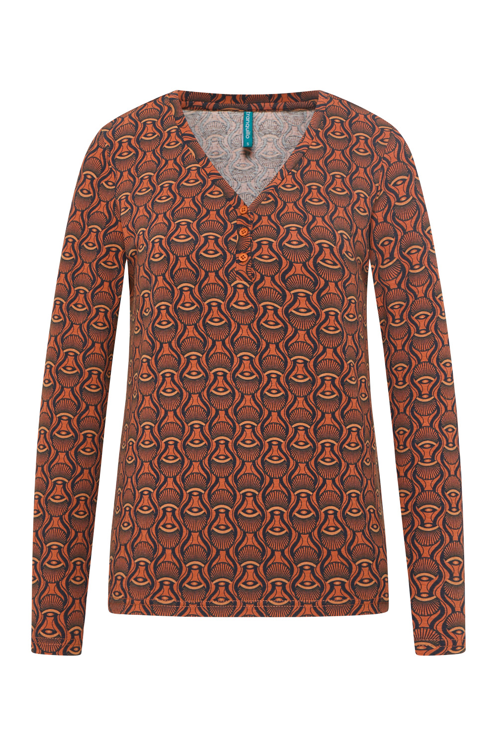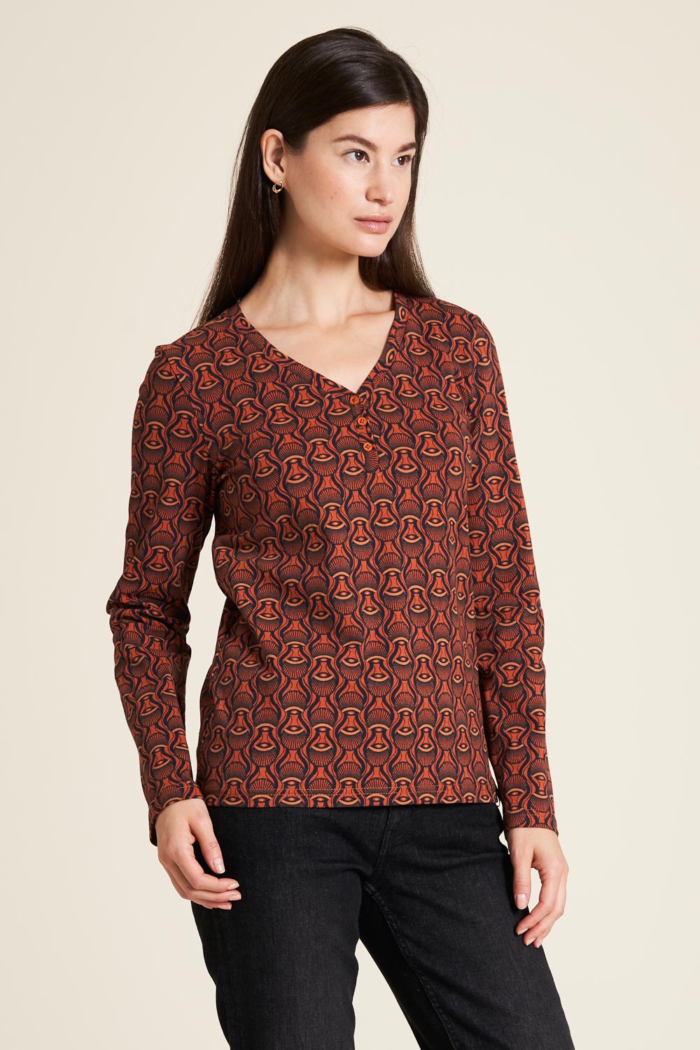 Weicher Stoff schmeichelt deiner Haut, während der V-Ausschnitt mit den Knöpfen deine Figur von ihrer besten Seite präsentiert. Das weiche Jersey Shirt mit V-Ausschnitt ist Figur nah geschnitten.