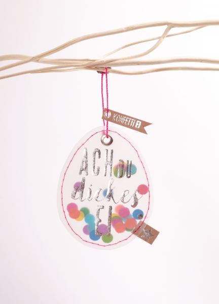 Papieranhänger aus Transparentpapier mit Konfetti gefüllt und Aufschrift in silber.
