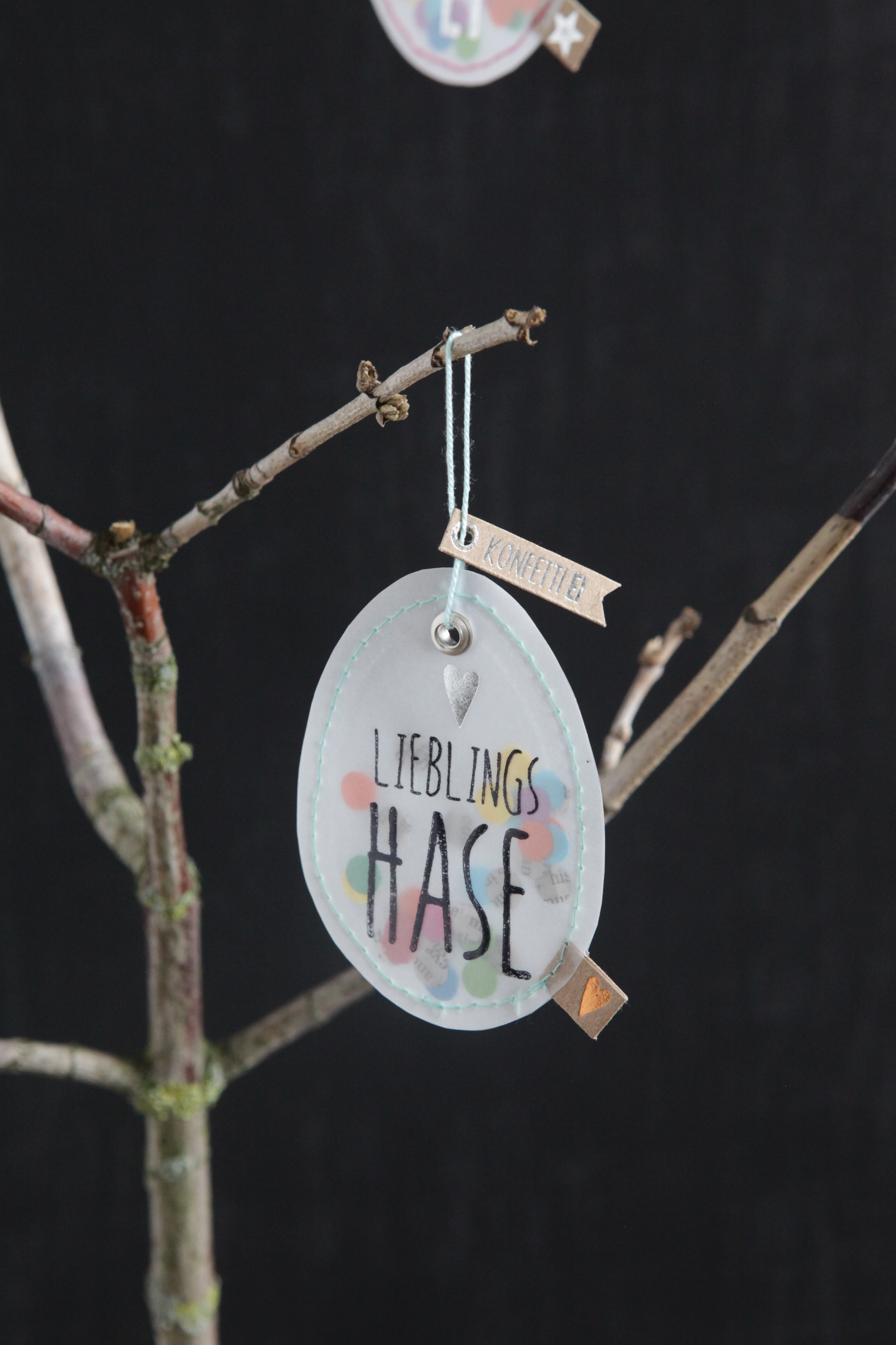 Papieranhänger aus Transparentpapier mit Konfetti gefüllt und Aufschrift in schwarz.