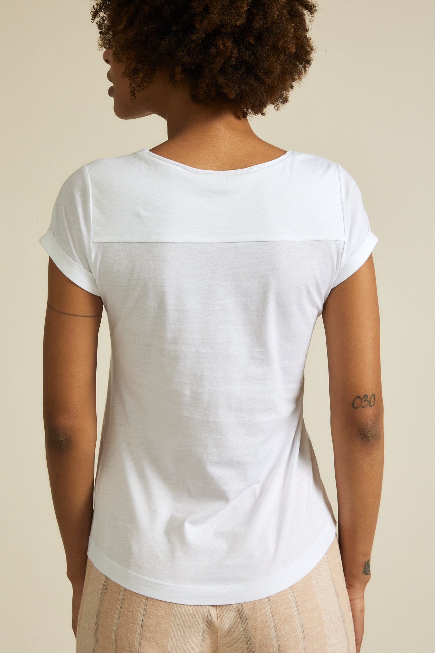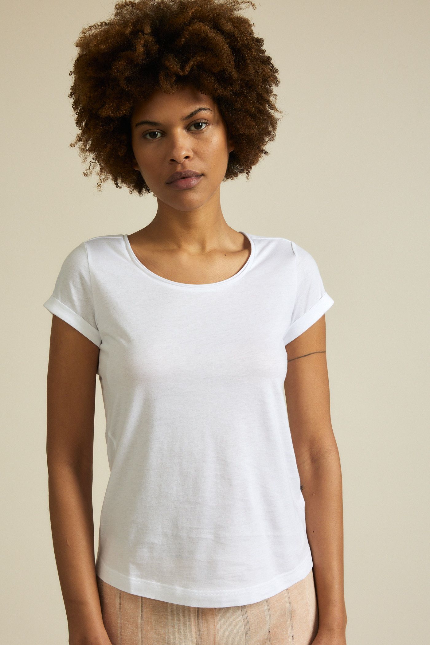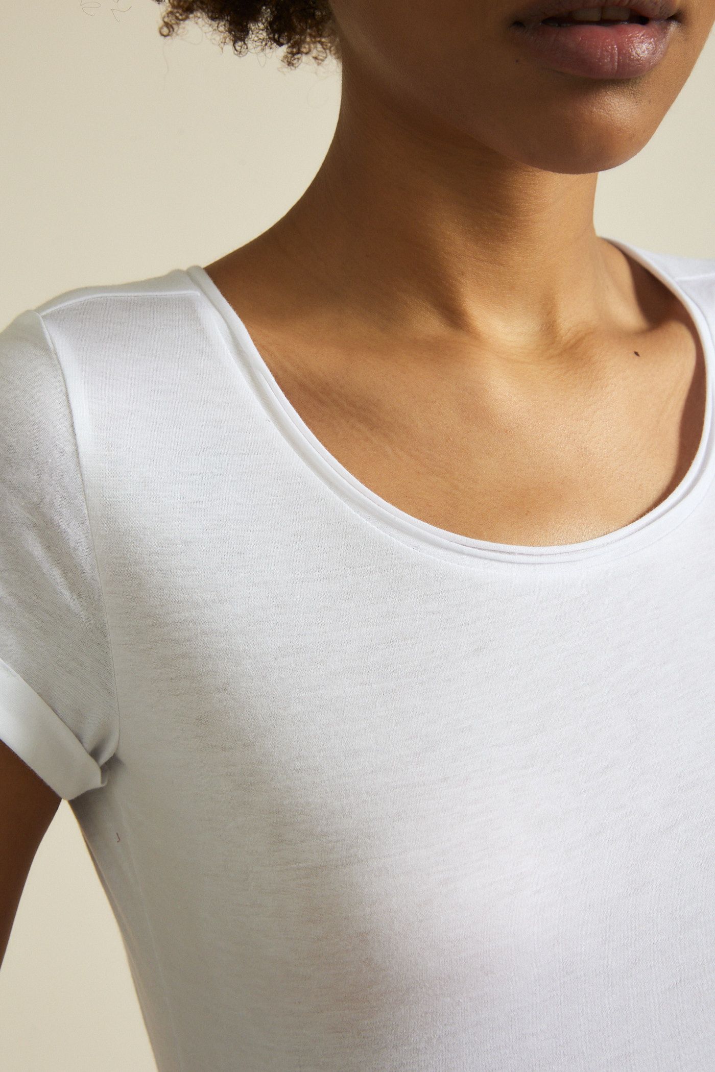 Feinste Jerseyware mit femininer Passform, leicht tailliert, abgerundetere Saum, Rundhalsauschnitt mit Rollkante, Verstärkung an Rücken - und Schulterpartie fair produziert in Europa.