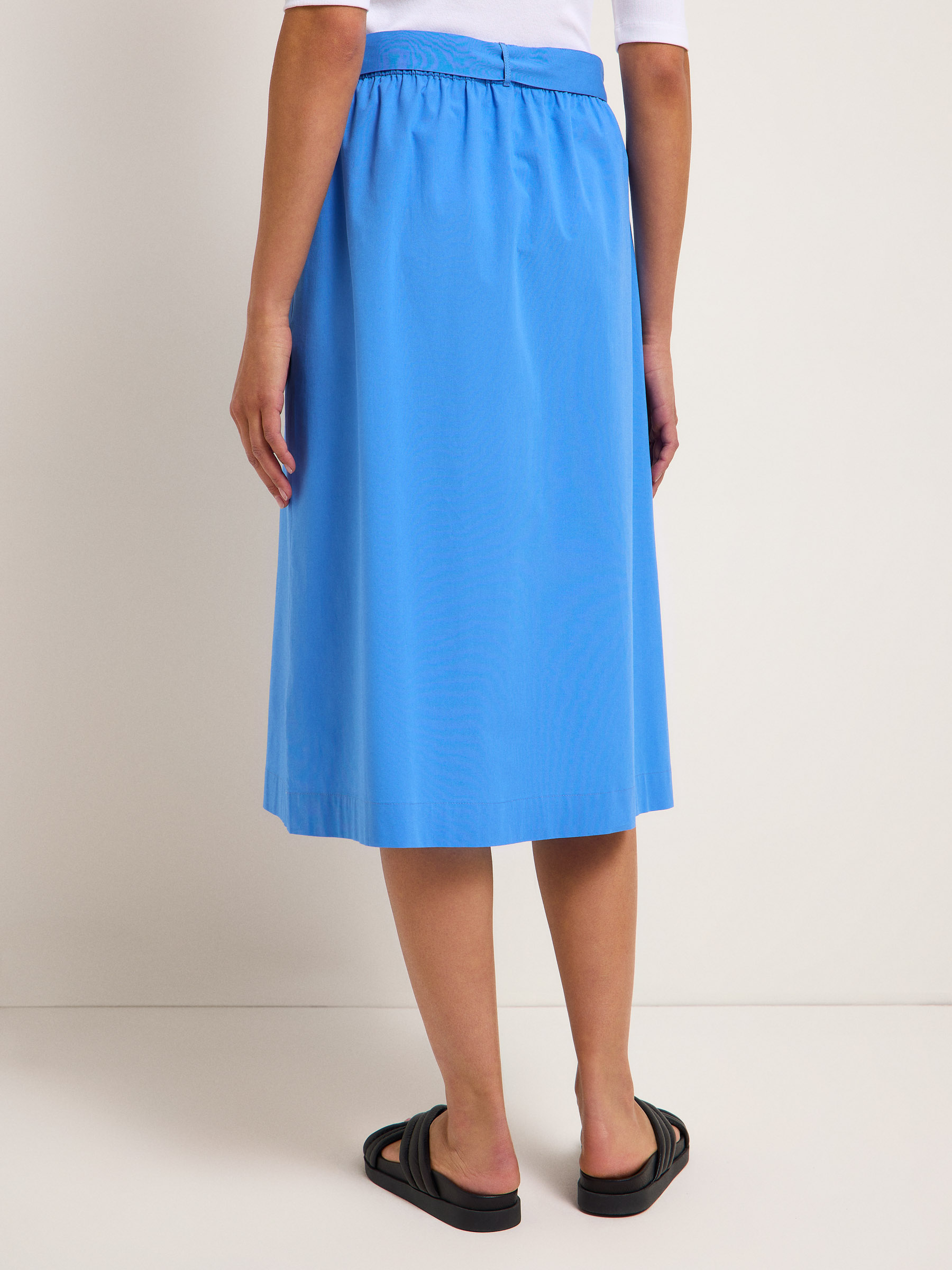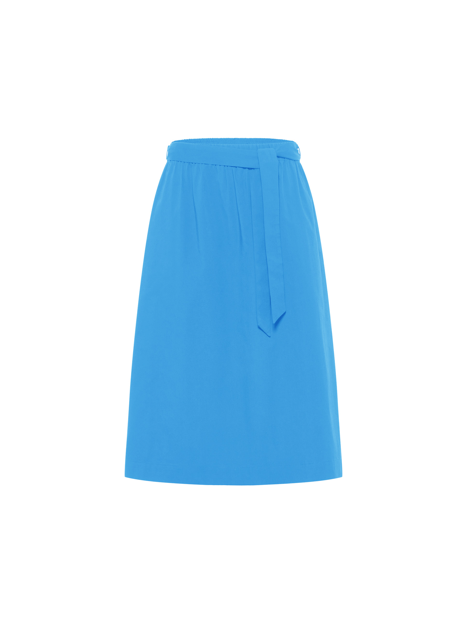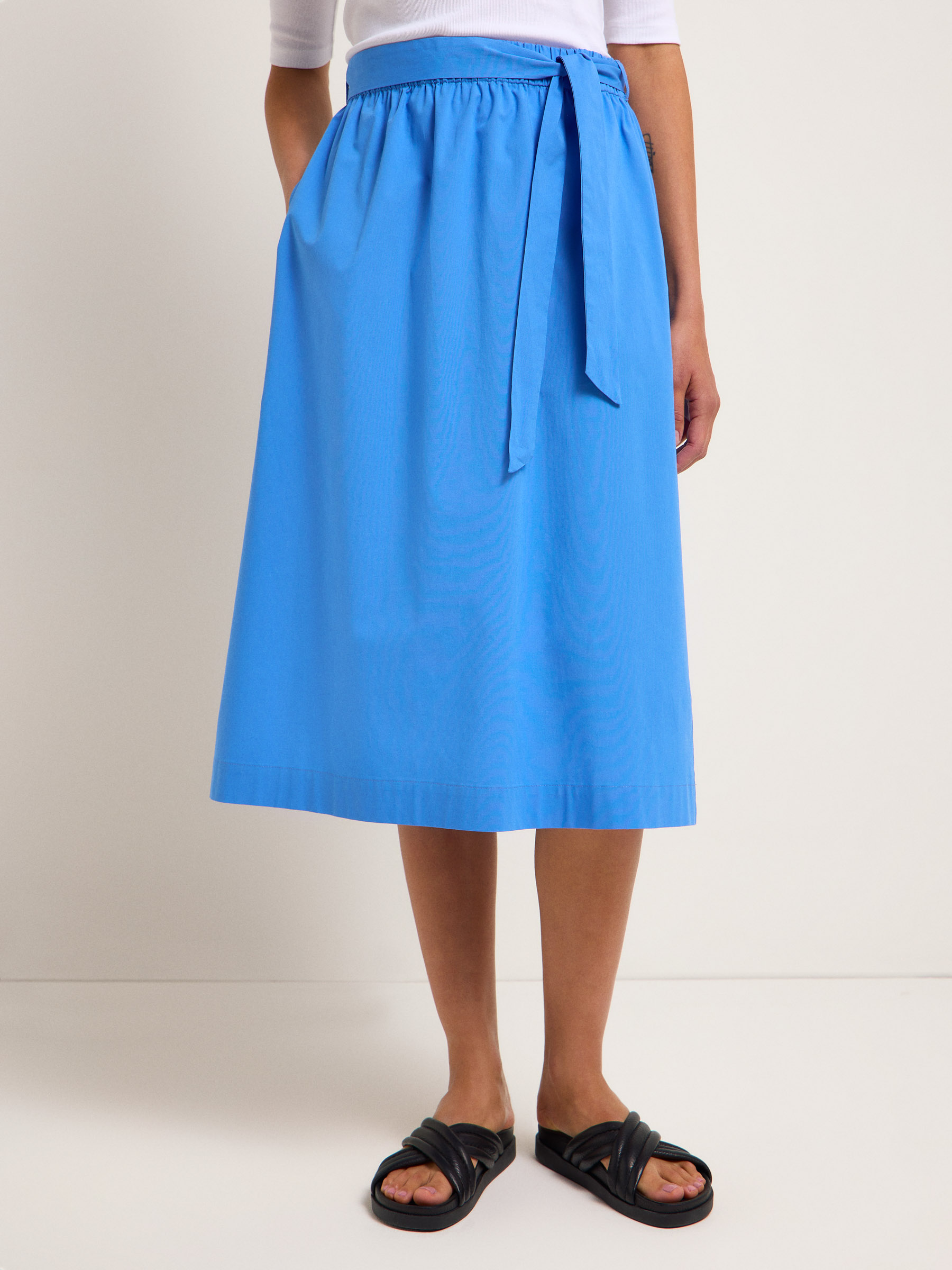Sommerlicher Rock in Midilänge aus leichter Bio-Baumwolle und Elasthan mit seitlichen Eingriffstaschen. Der Bund gibt durch ein Gummi nach und ist mit dem Bindegurt zusätzlich taillierbar.