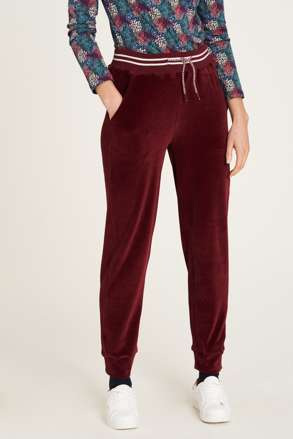 Wunderbar weich und unglaublich bequem ist diese Hose von Tranquillo aus einem Nicki-Stoff im Bio-Baumwoll-Mix. Der gestreifte Rippstrick-Bund mit Kordelzug und die flexiblen Bündchen schenken dir ein Plus an Komfort. Ergänzt wird die lange Hose durch zwei Eingrifftaschen. Trage die Jogpants zum passenden Pullover.