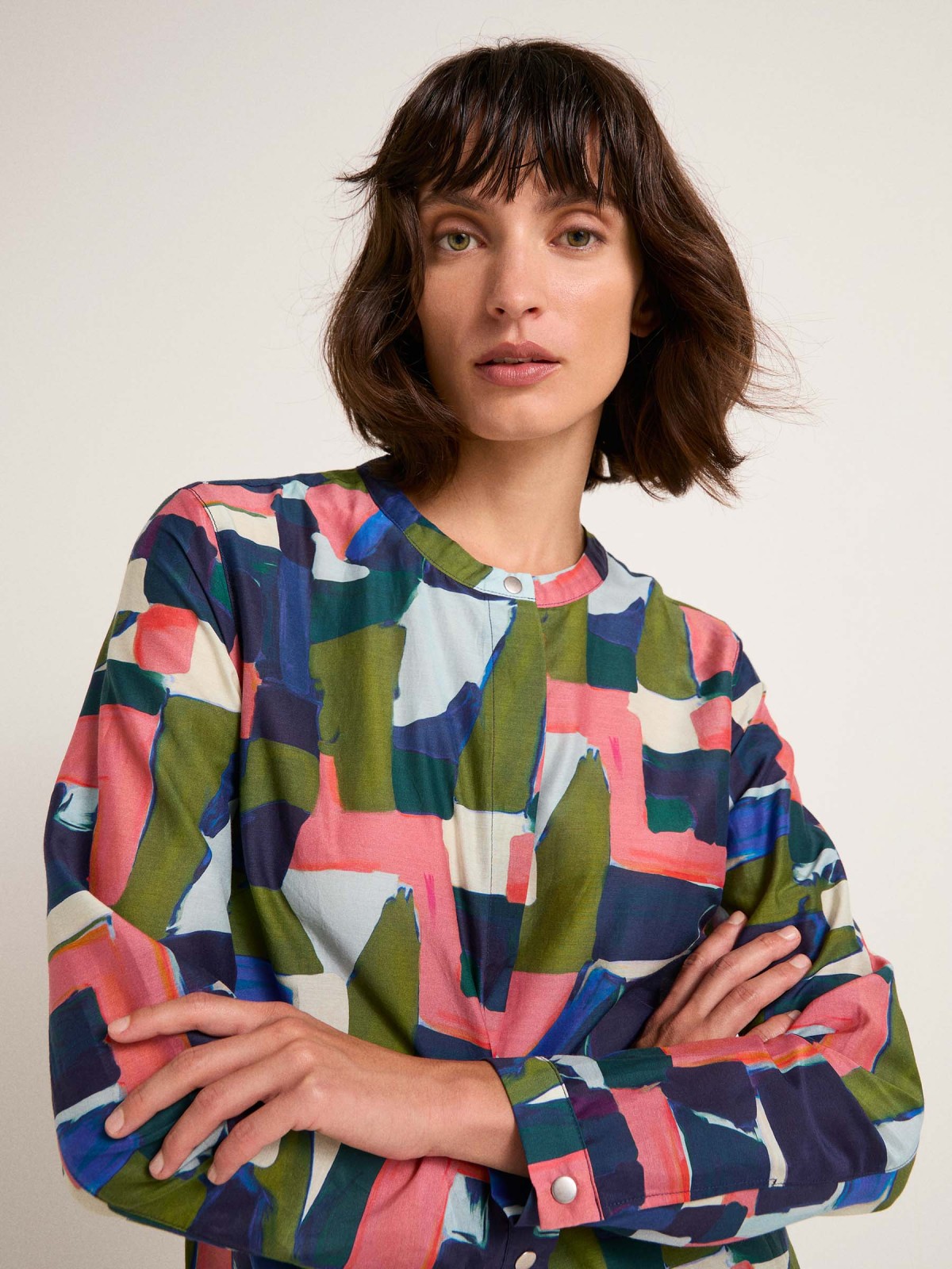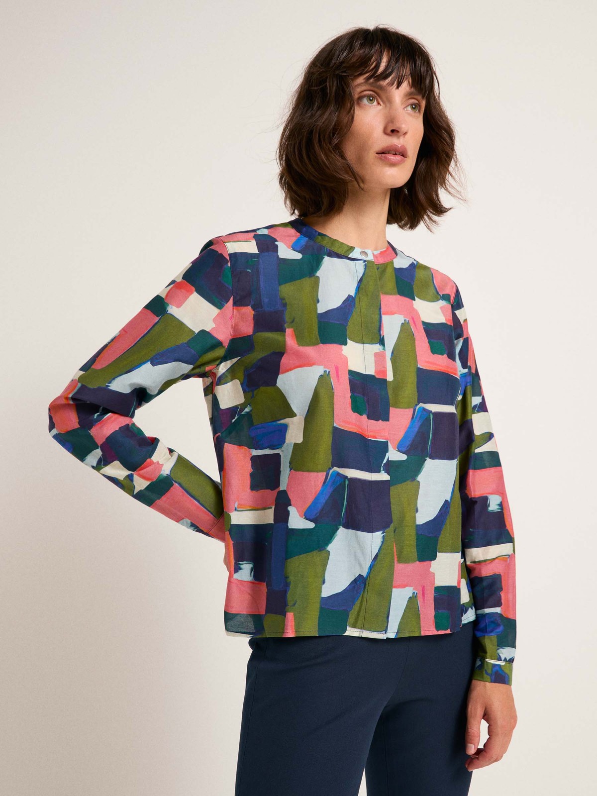 Der neue Print und die hochwertige Materialmischung aus Bio-Baumwolle und Seide machen die Bluse schnell zu einem Lieblingsteil. Der hoch geschlossene Stehkragen und die langen Ärmel wirken elegant und klassisch als Kontrast zum farbenfrohen, abstrakten Print.