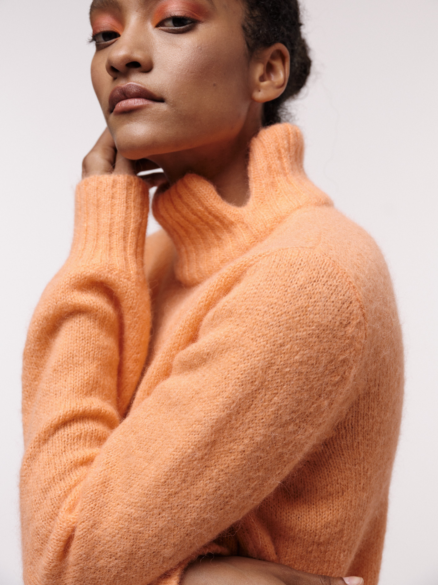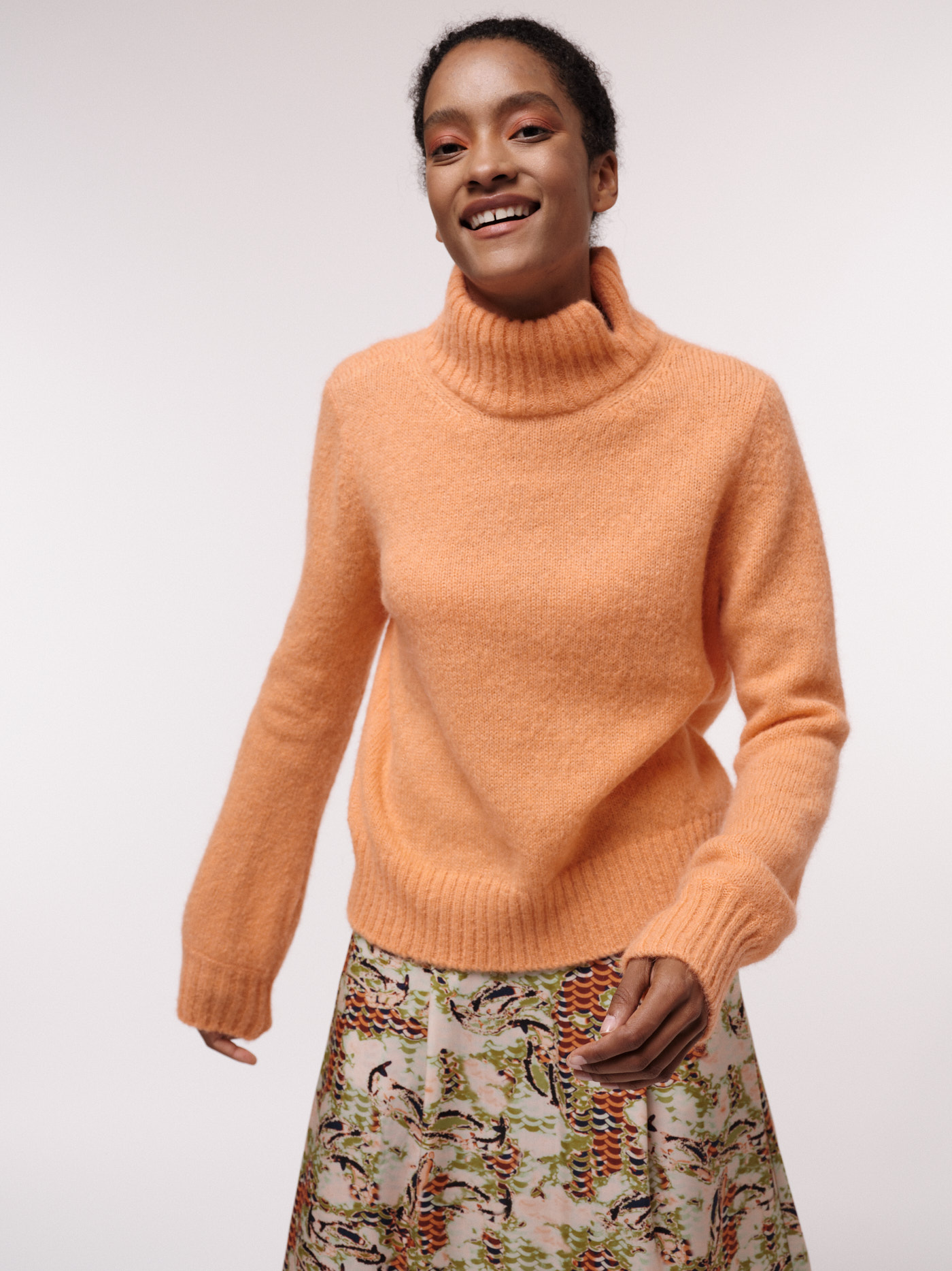 Wunderbar wärmender Stehkragenpullover aus peruanischer Alpakawolle Die Passform ist körpernah, die Ärmel sind lang, der Stehkragen hat einen seitlichen Schlitz, sodass er nicht einengt und der Pullover leicht an- und auszuziehen ist. Dieser Wollpullover ist angenehm leicht und lässt sich vielfältig kombinieren.