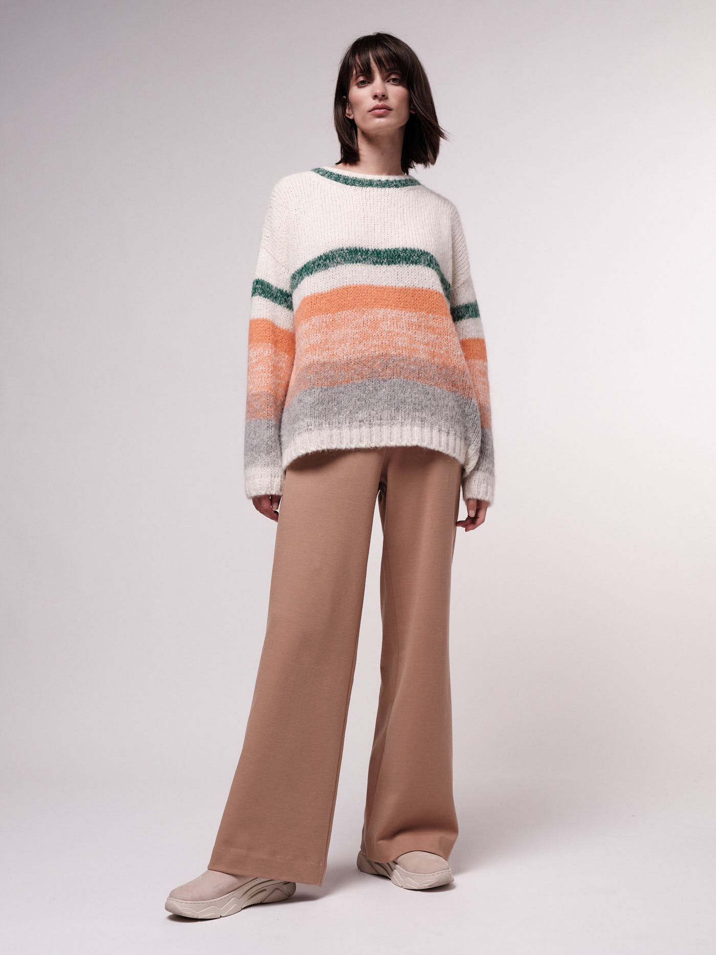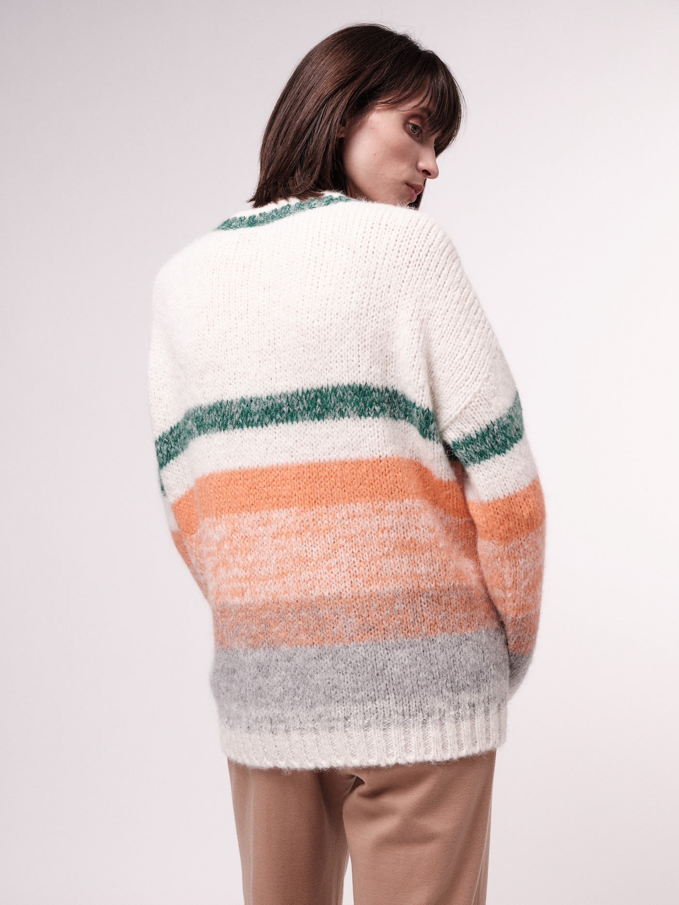 Leichter und weicher Pullover mit Streifen im Colourblock. Der Pullover ist der perfekte Begleiter für modische Looks zu jeder Jahreszeit. Die haarigen Alpaka Fasern wirken isolierend an kalten Tagen und sorgen zugleich für einen Wärmeausgleich, da sie in der Lage sind Wärme abzustoßen.