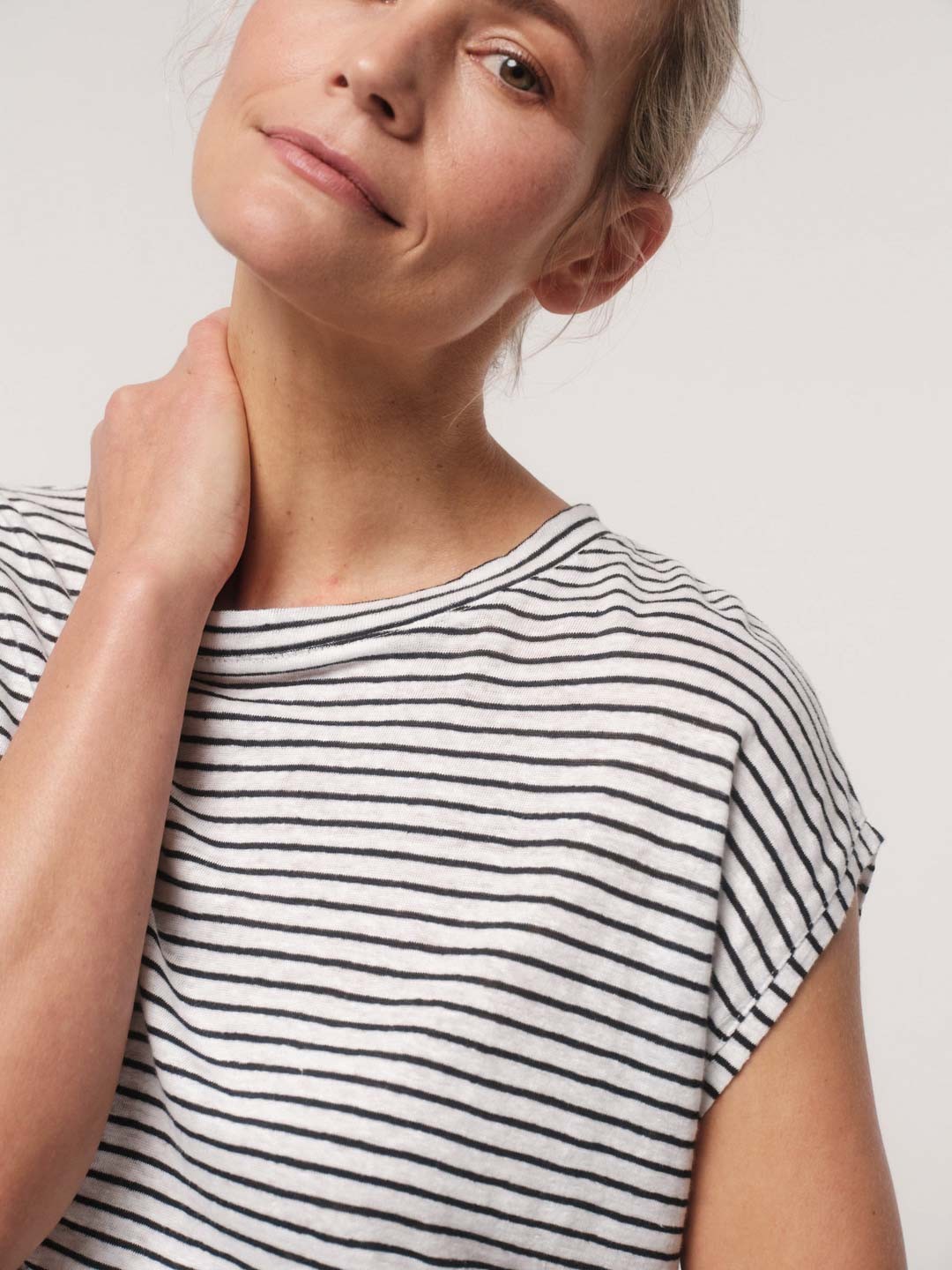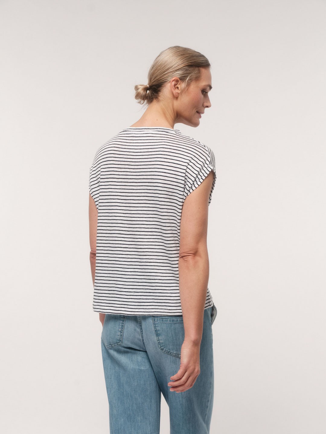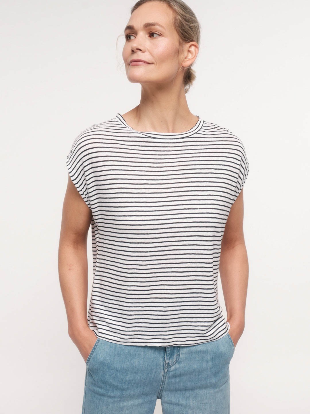 Das gestreifte Kurzarmshirt mit verkürzten Ärmeln und locker überschnittener Schulter sorgt für einen legeren Look.