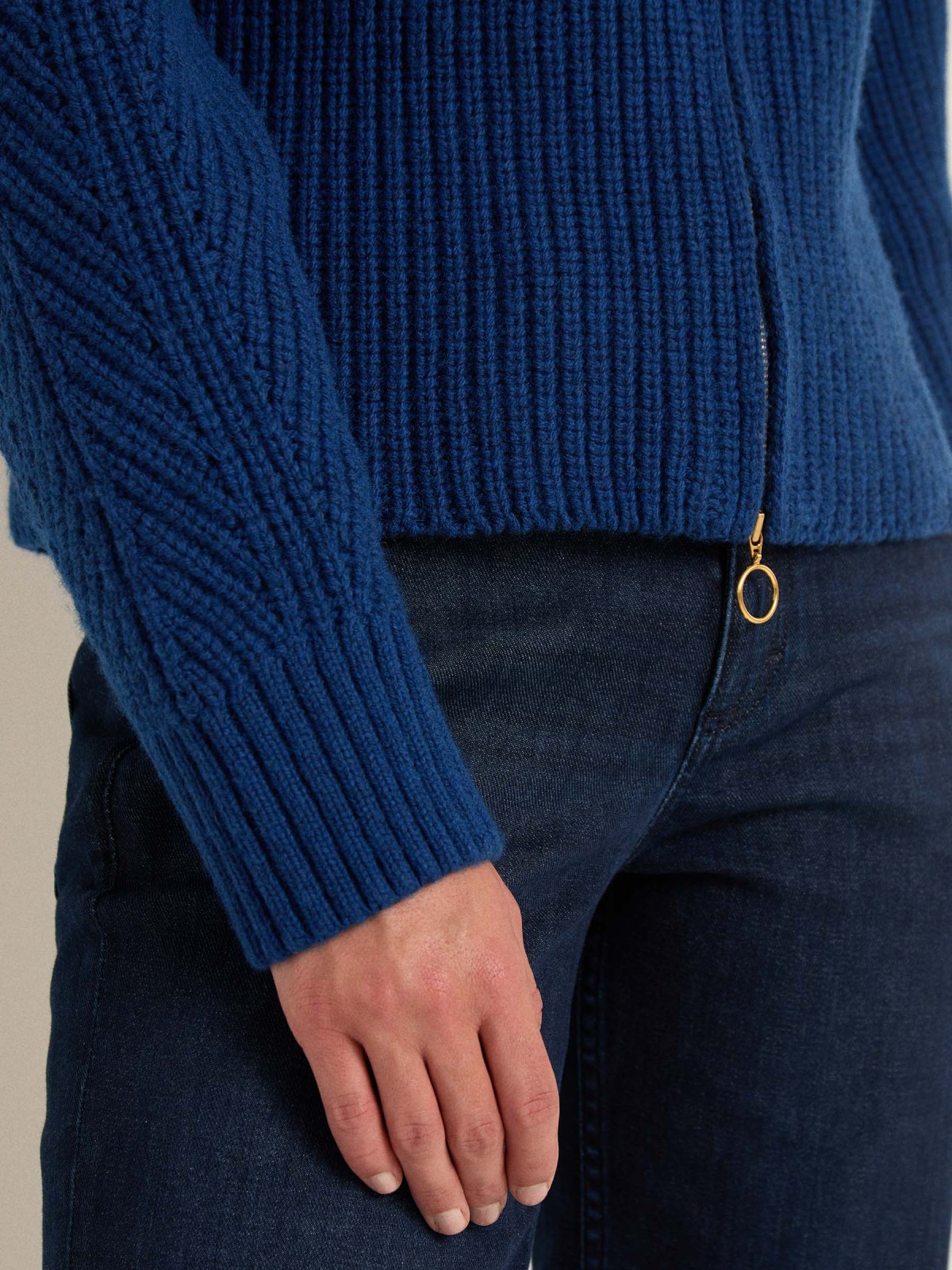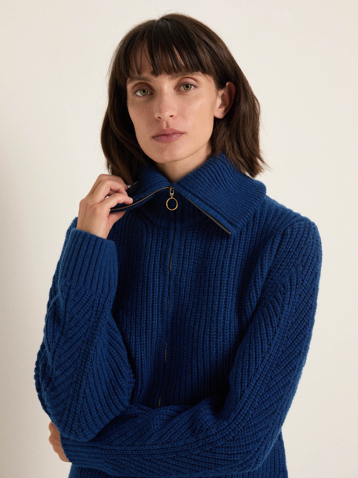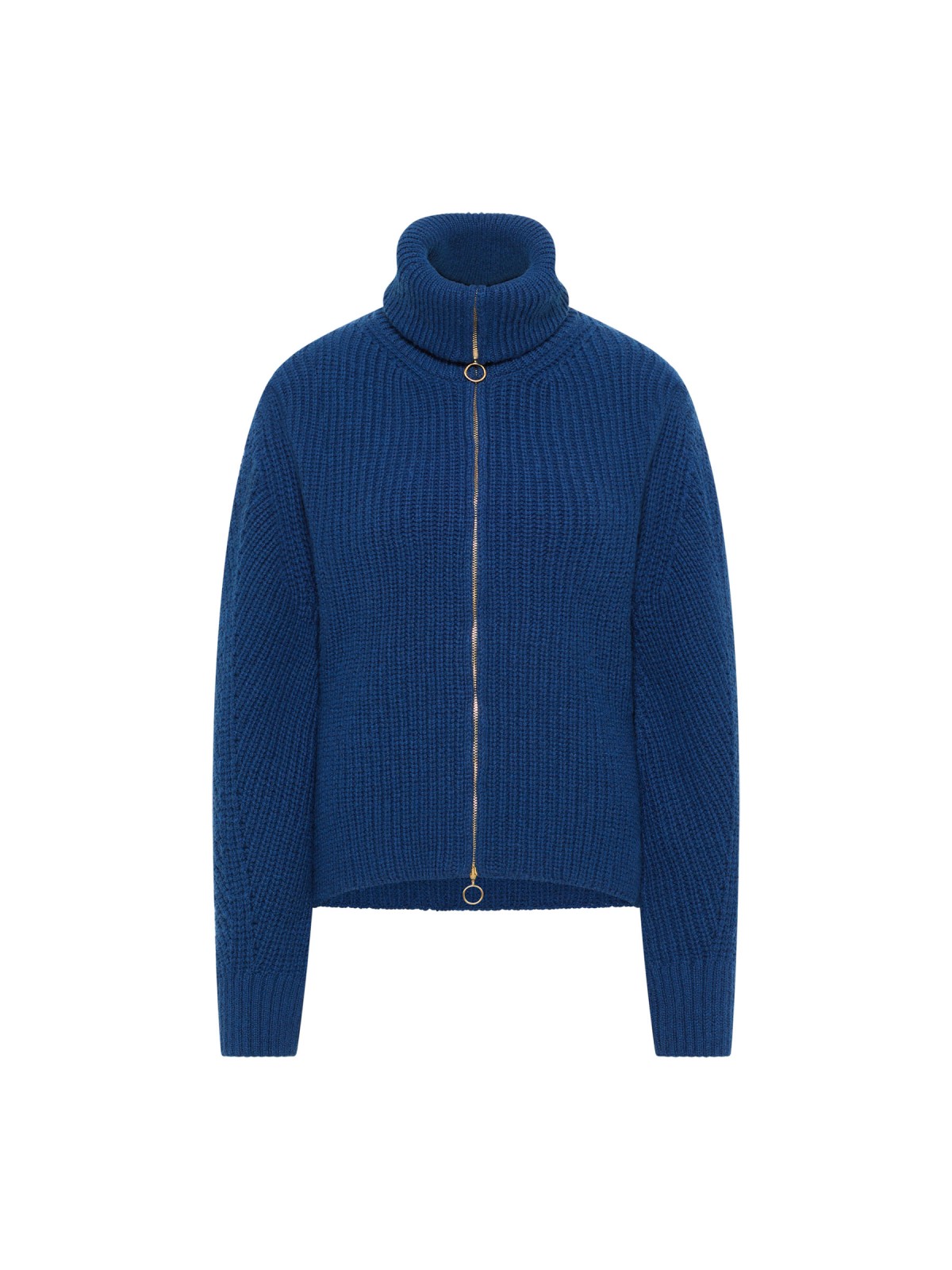 Oversized geschnitten, mit hohem Kragen und Reißverschluss lässt sich der Strickcardigan vielfältig tragen und kombinieren. Wenn Sie es nicht allzu locker mögen, empfehlen wir eine Größe kleiner zu wählen.
