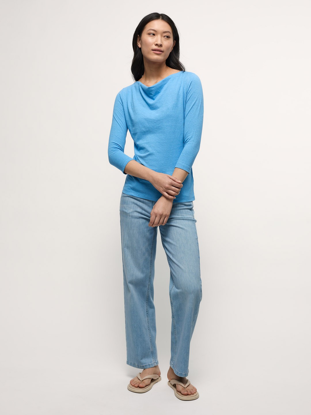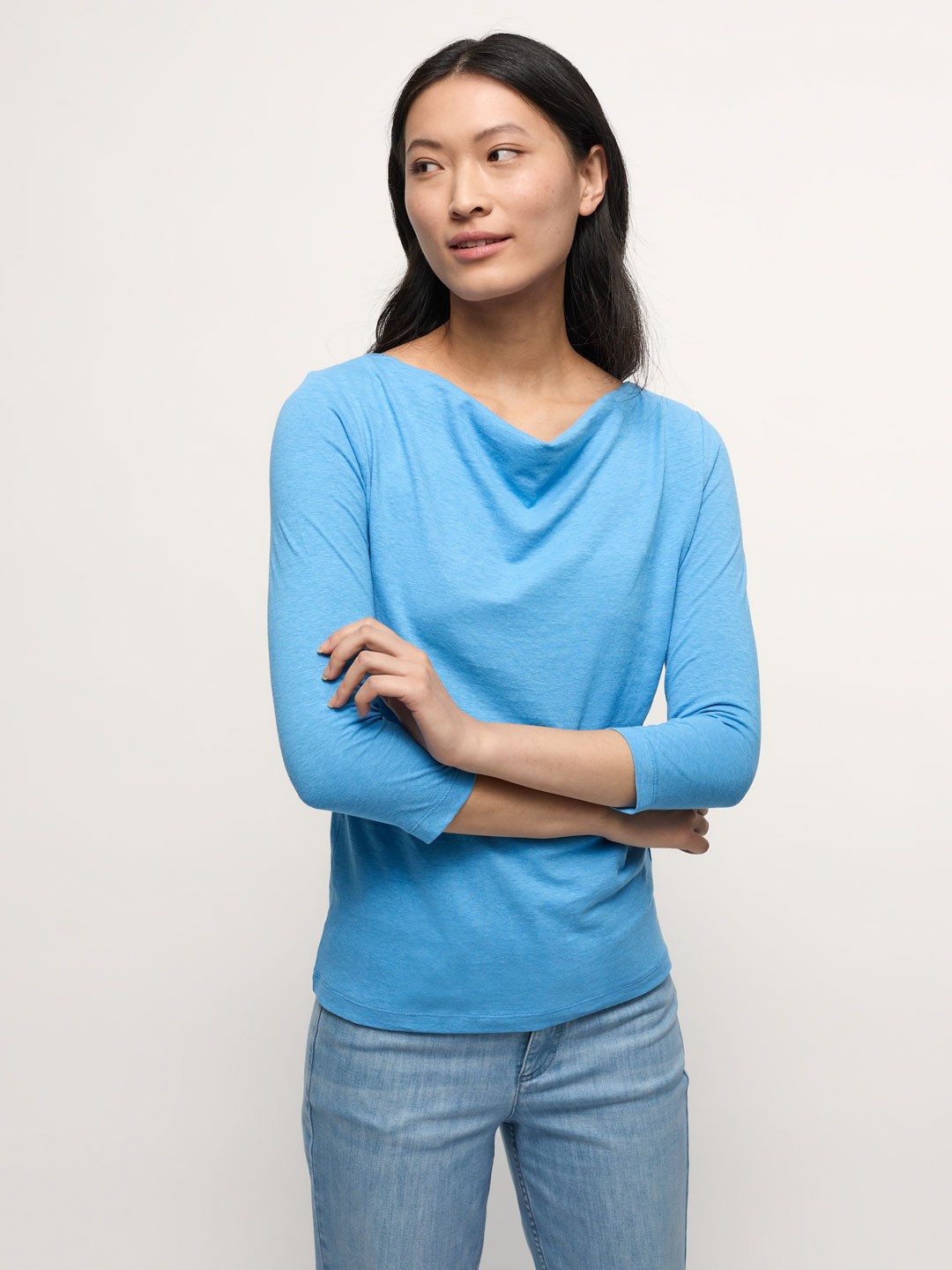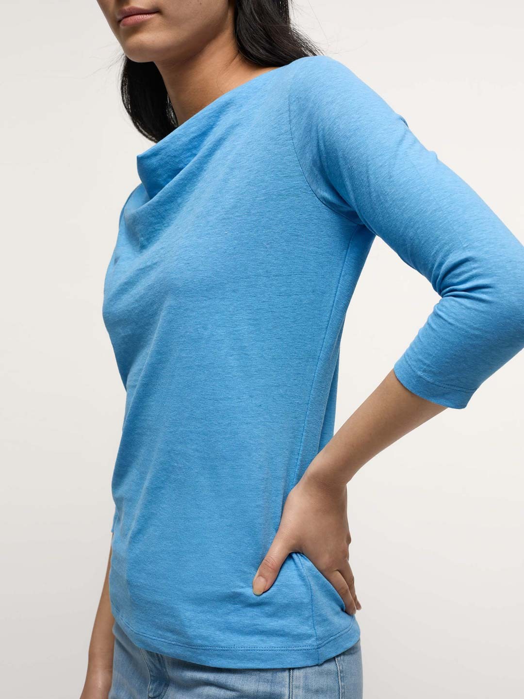 Der weich fließende Hanf-Jersey ist bei LANIUS etabliert als unverzichtbare Qualität für Ihre Frühjahr/Sommer-Kollektion. Bio-Baumwolle und Hanf wirken temperaturausgleichend und sorgen für den leichten Fall der Ware. Der Wasserfallausschnitt umspielt edel das Dekolleté ohne zu viel Haut zu zeigen.