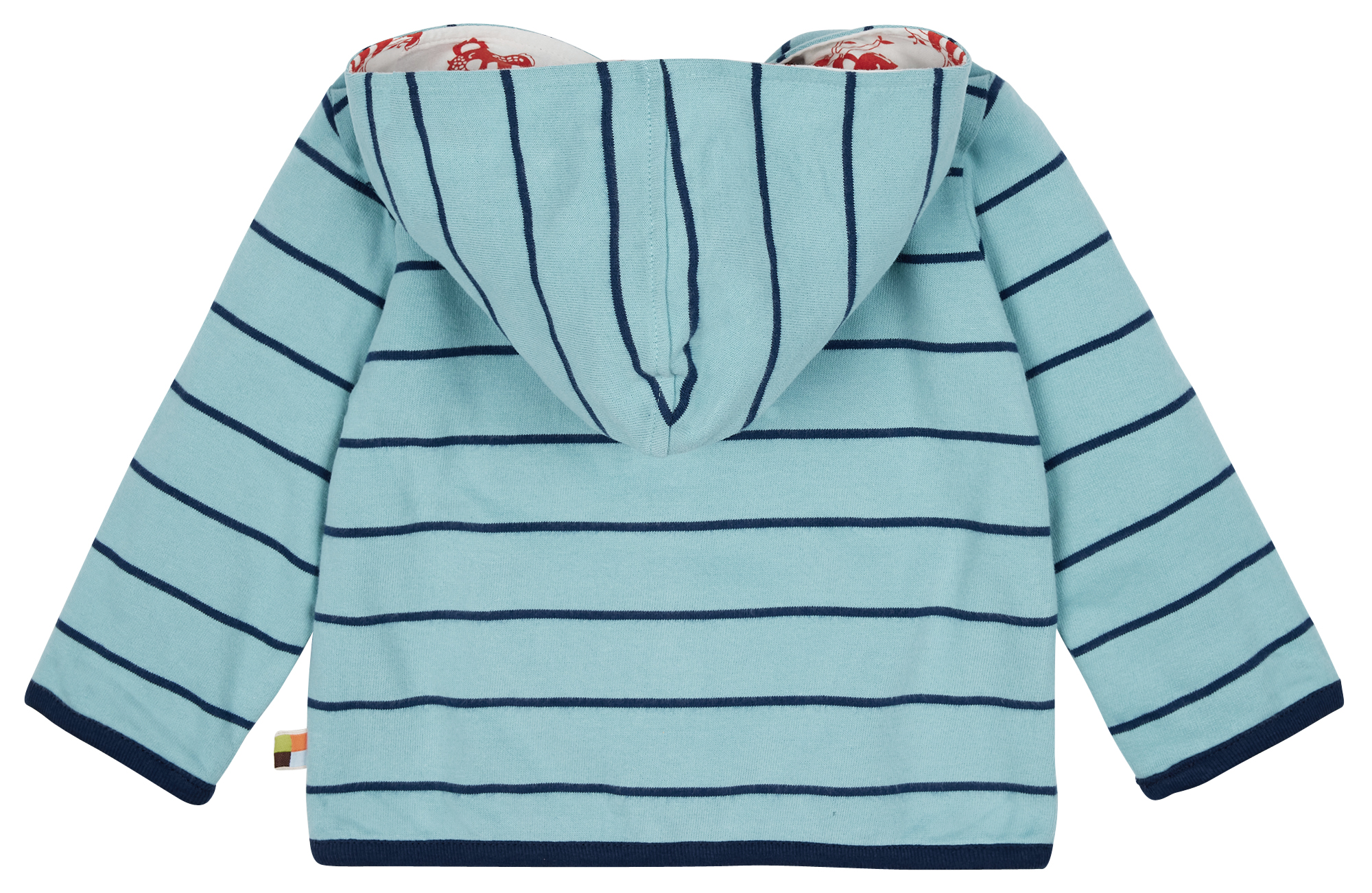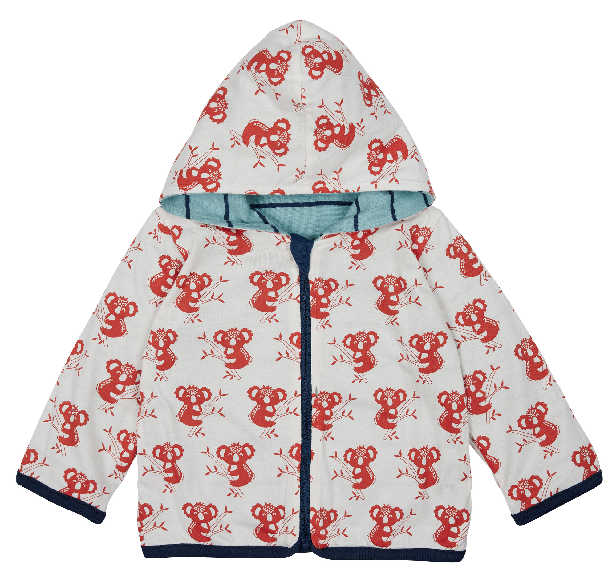 Wendejacke mit Kapuze. Eine Seite ist aus bedrucktem Jersey, die andere Seite aus geringeltem Interlock gefertigt. Alle Kanten sind kontrastfarbig eingefasst. Vorne mit kontrastfarbigem Reißverschluss mit Wendeschieber. Logo-Etikett mit Fähnchen an der Seitennaht.
